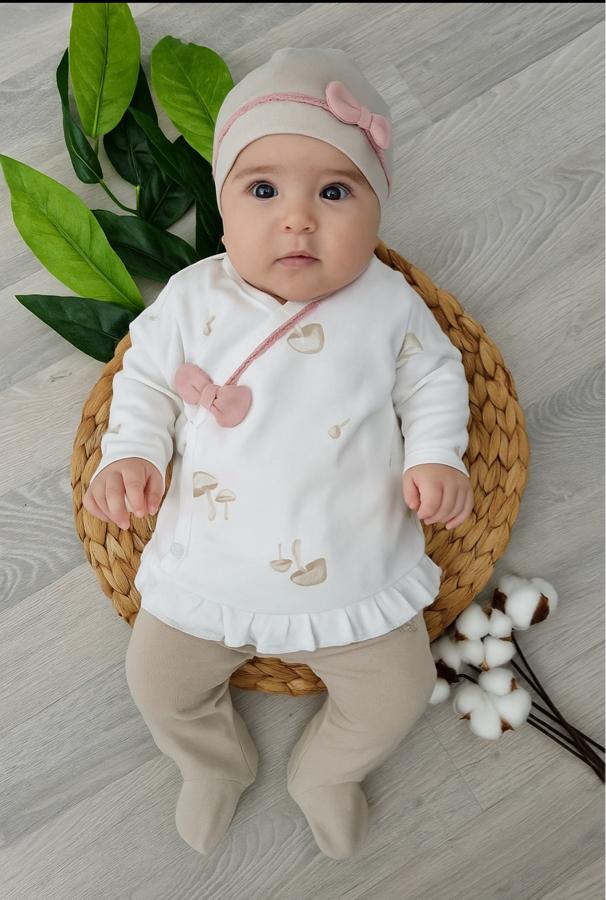 ☘️Organik Yenidoğan Kız Bebek Mantar Desenli 3'Lü Takım